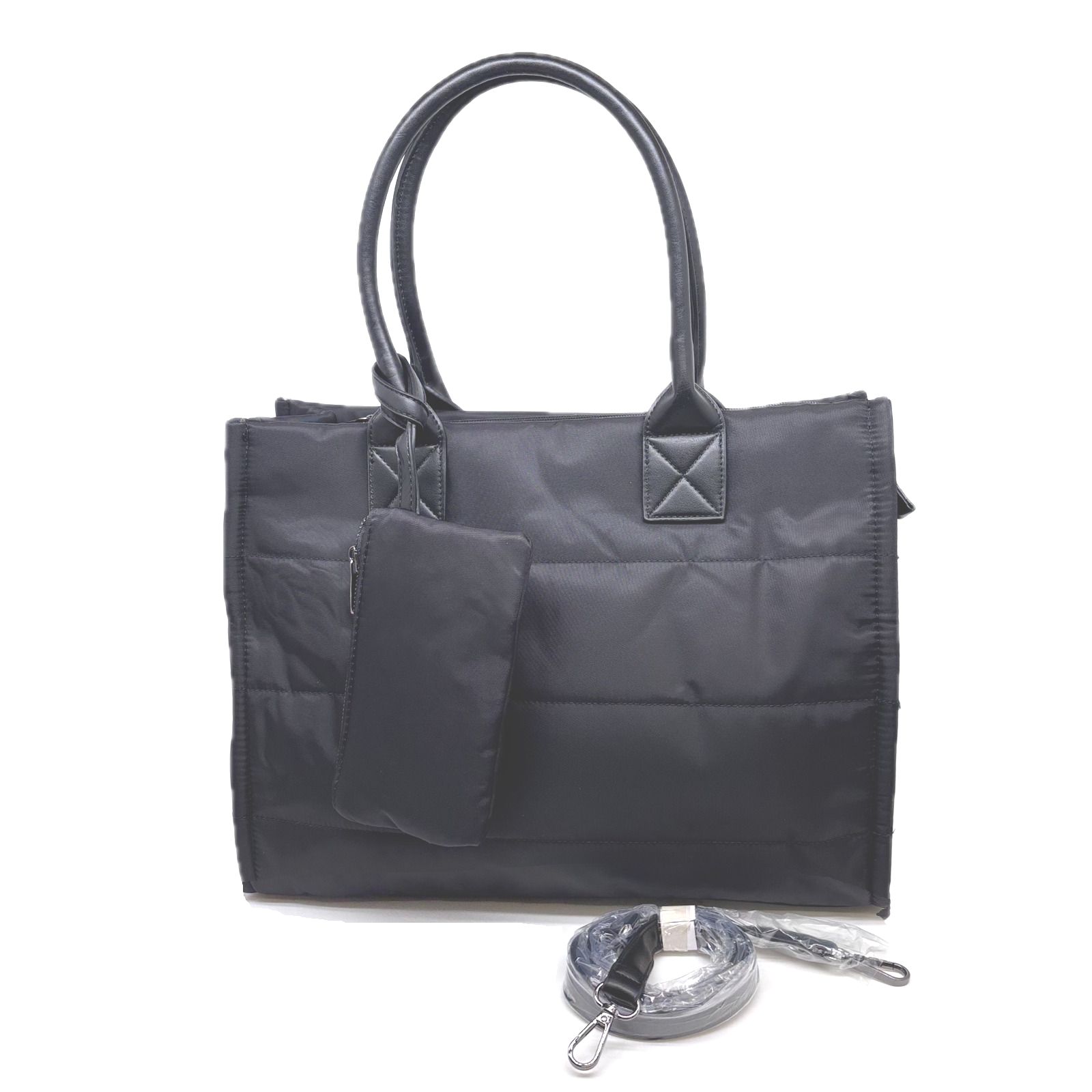 Diese schwarze Textiltasche ist ein echtes Multitalent für Alltag und Business. Ihr elegantes, gestepptes Design verleiht ihr eine edle Struktur, während die klaren Linien und robusten Henkel für zuverlässige Funktionalität sorgen. Ob in der Hand getragen oder mit dem abnehmbaren Schulterriemen lässig über der Schulter – sie passt sich Ihrem Stil an.